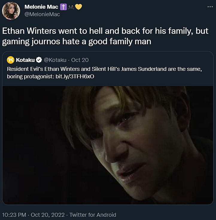Kotaku derided Resident Evil and Silent Hill protagonists Ethan Winters and James Sunderland as “the same, boring protagonist;” only for the author to later claim the editorial was a “s—tpost.” YouTuber Melonie Mac took them to task, regardless.