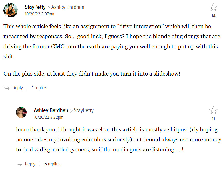 “lmao thank you, i thought it was clear this article is mostly a s—tpost (rly hoping no one takes my invoking columbus seriously) but i could always use more money to deal w disgruntled gamers, so if the media gods are listening…..!” the writer confessed in response to the user’s comment.