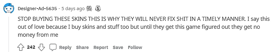 “STOP BUYING THESE SKINS” /u/Designer-Ad-5635 begged. “THIS IS WHY THEY WILL NEVER FIX SHIT IN A TIMELY MANNER. I say this out of love because I buy skins and stuff too but until they get this game figured out they get no money from me.”